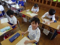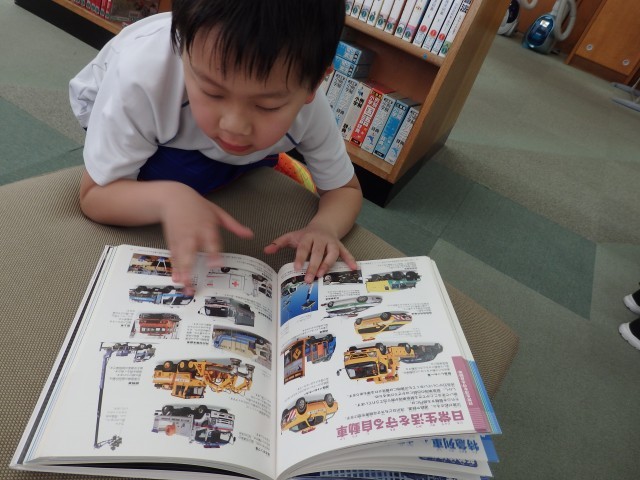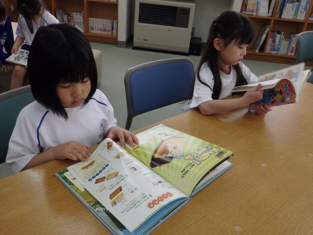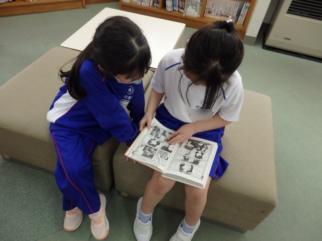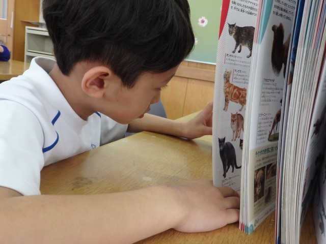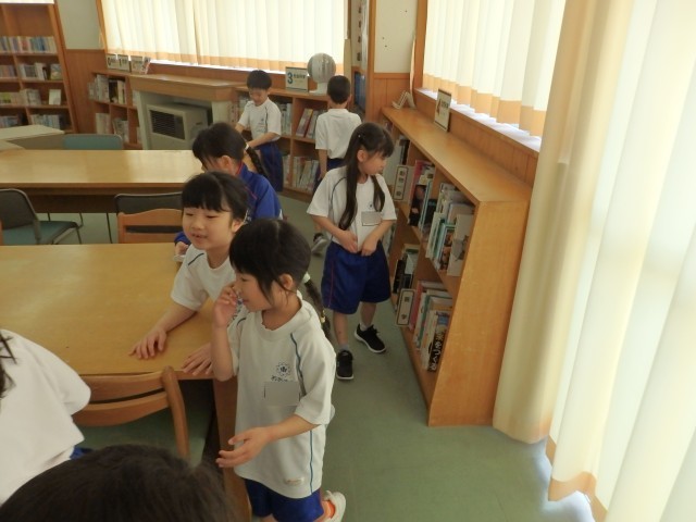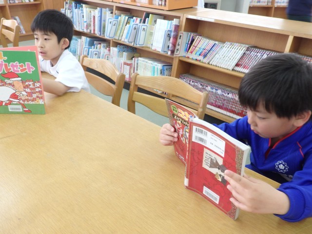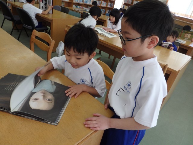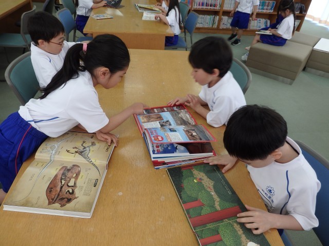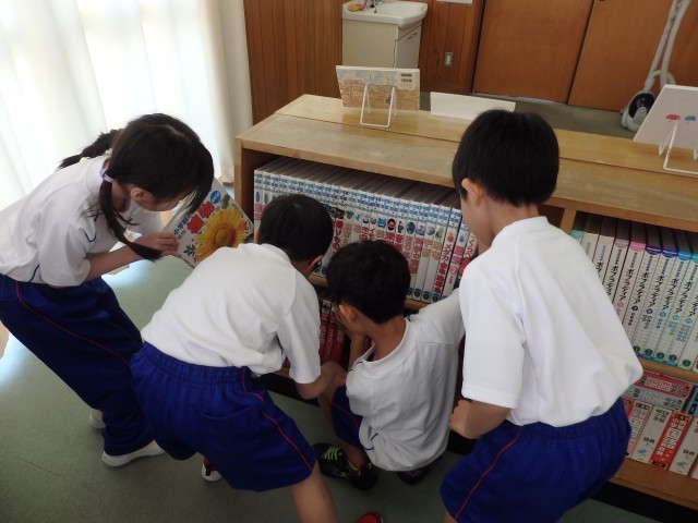 1年生の国語の授業、後半は図書室で読書をしました。好きな自動車や恐竜、星の図鑑を選んで目を輝かせて見ている子、名探偵コナンシリーズや「○○のひみつ」というマンガの本を選んで「読んでみたかったんだ」という子、怖い絵本を見つけてみんなに見せている子などがいました。たくさん読んで、本に親しんでほしいです。
