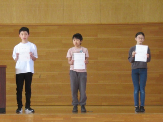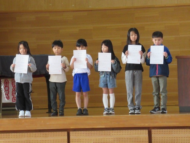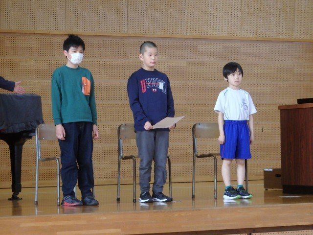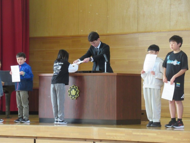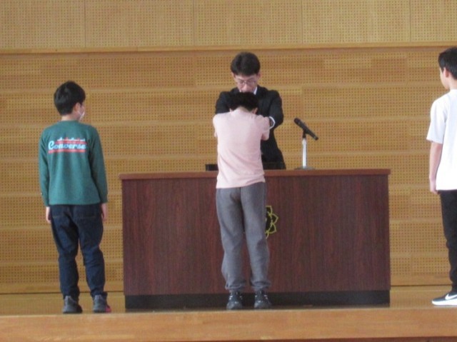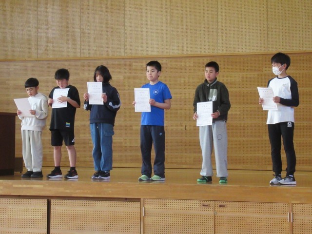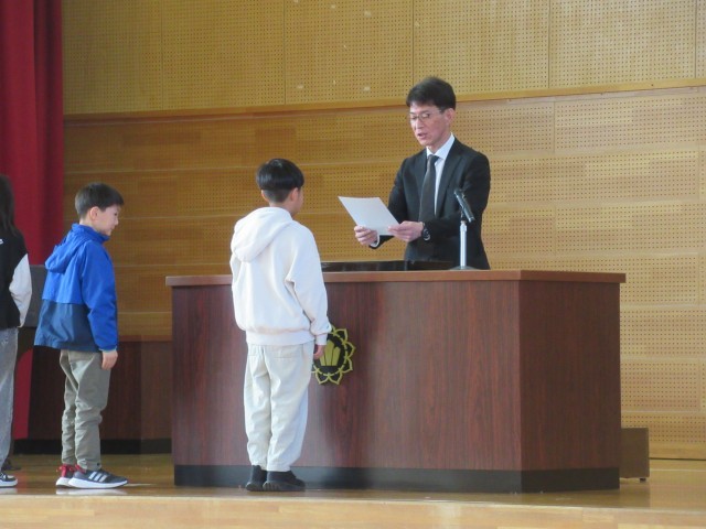 今日はひまわり朝会を行いました。今日の整列1番は3年生でした。整列した後も静かに待つことができました。全校が並び終わるのもとても早かったです。朝会ではまず、2,4,6年生の代表の子が1学期のめあてを発表してくれました。「難しいことにも粘り強く挑戦したい」と力強く話してくれました。その後、前期の専門委員長と1学期の学級委員の任命式を行いました。名前を呼ばれたら大きな声で「はい!」と返事をしてステージに上がり、任命書を手渡すときに「お願いします」と声を掛けると「ありがとうございます」と答えてくれました。リーダーとしての頼もしさを感じました。自覚と責任をもって学校を引っ張ってほしいです。