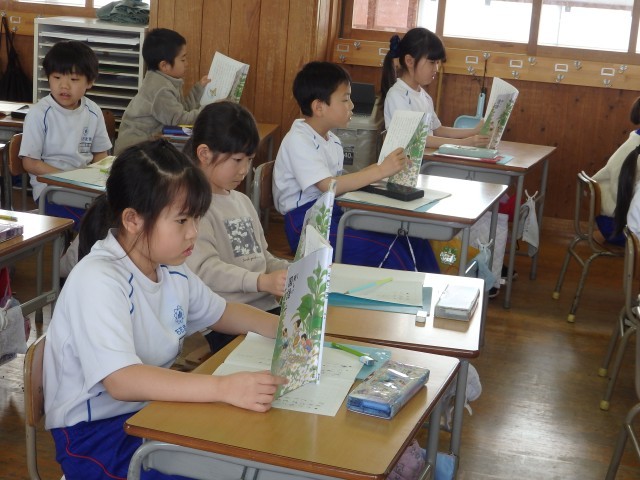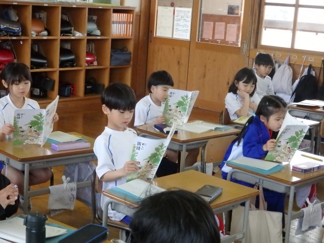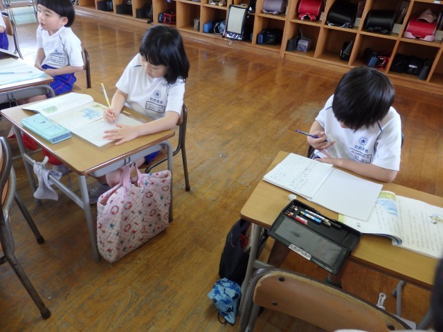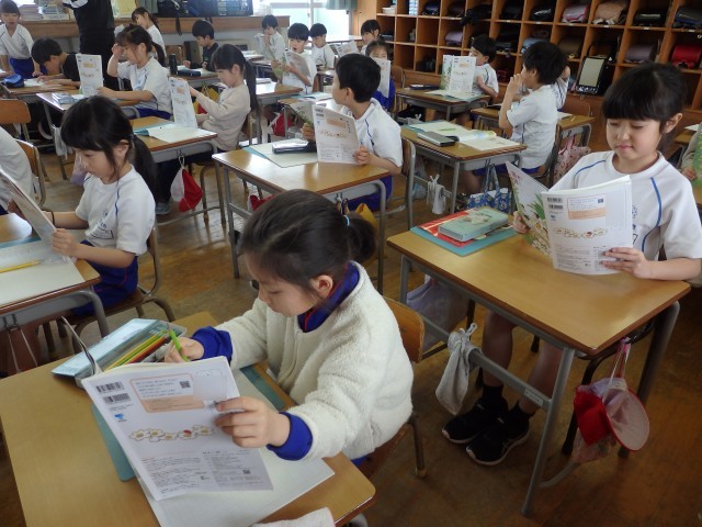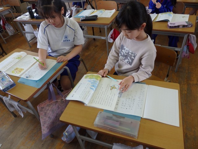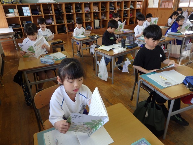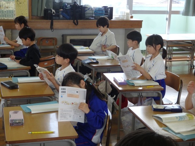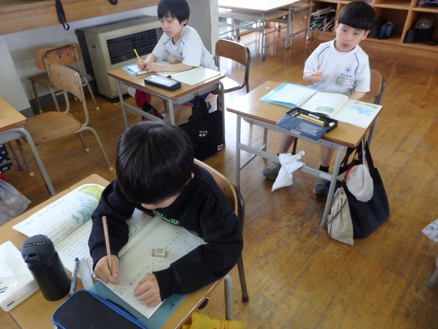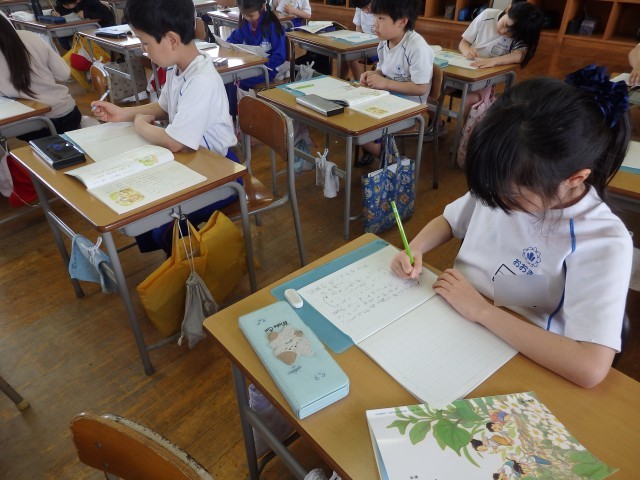 2年生の1時間目は国語の授業でした。「風のゆうびんやさん」の学習です。みんなで丸読みをしました。両手で教科書を持って読む姿勢がいい子がたくさんいました。また、読み終わった感想も書きました。「いいな」と思ったところや不思議に思ったところなどをノートに書きました。3行以上も書いている子がたくさんいました。