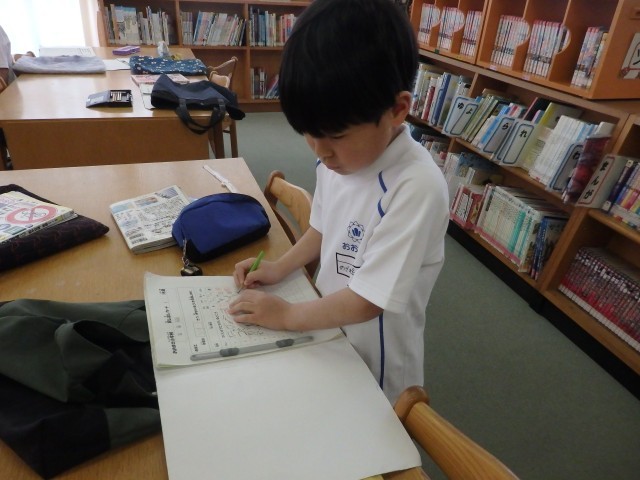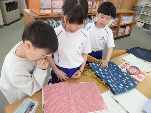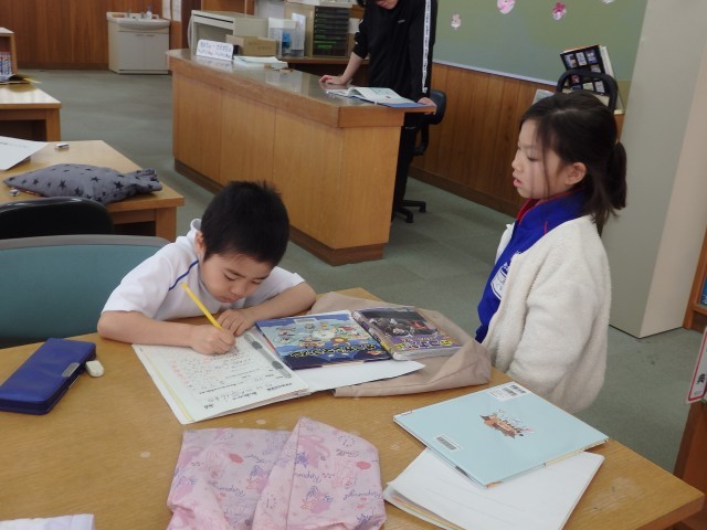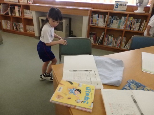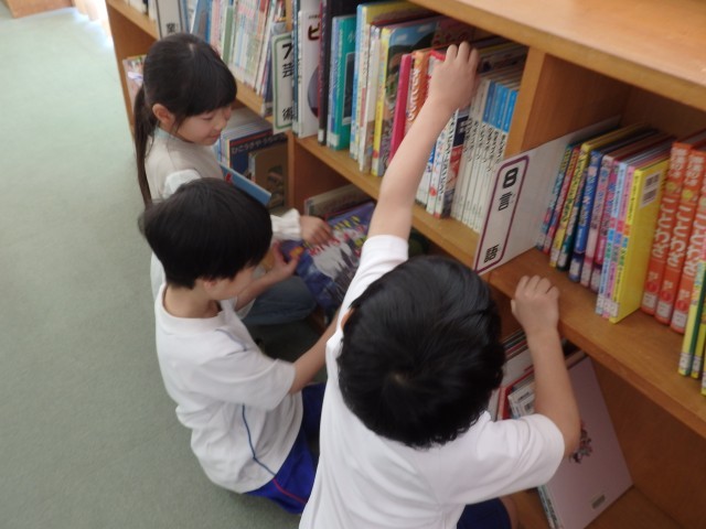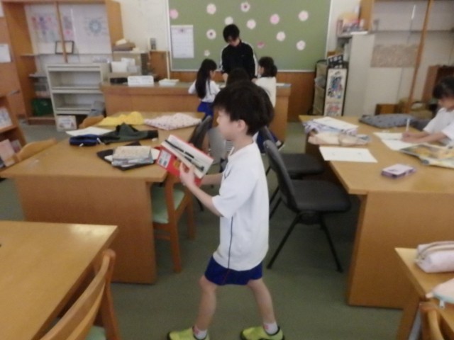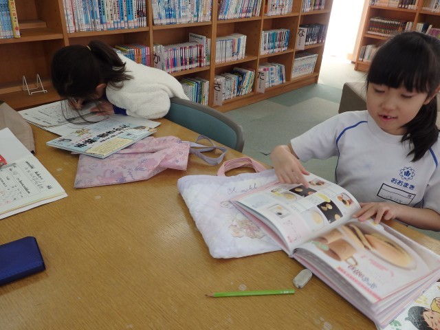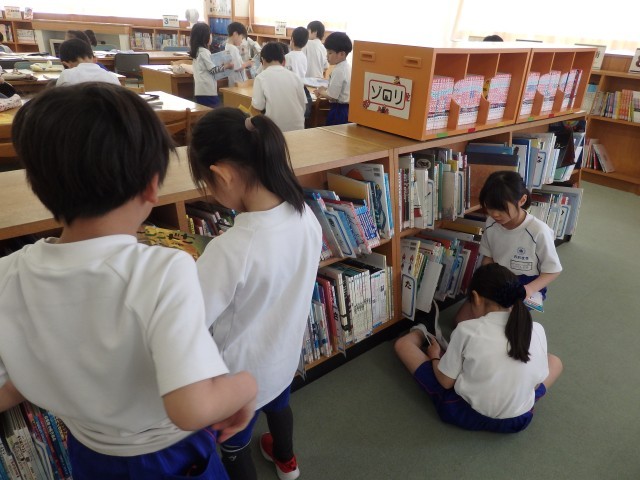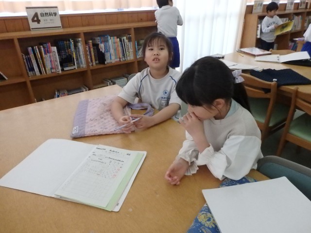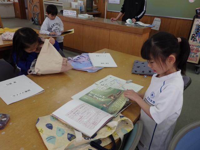 2年生の1時間目です。図書室で本を借りました。「名前占いの本がないよ~」「アナと雪の女王はないの?」とつぶやいていたり、友だちが持っていた絵本を見て「これ、次貸して」と話していたりしていました。たくさん本を読んで、読書を楽しんでほしいです。