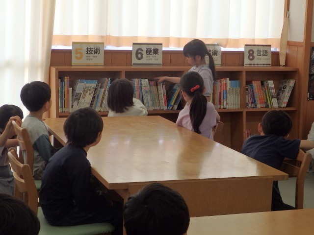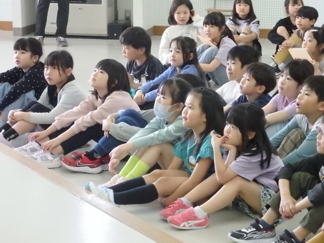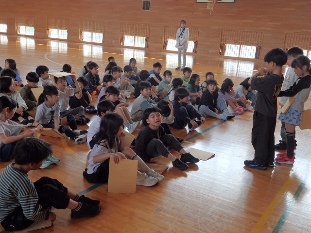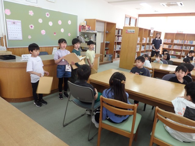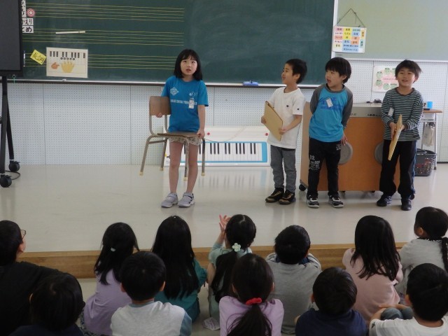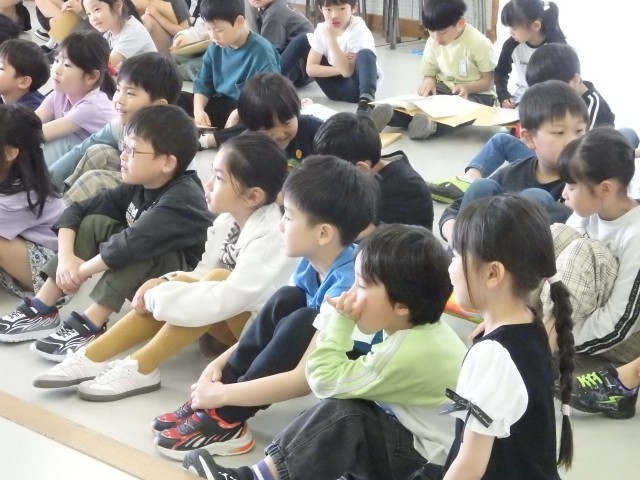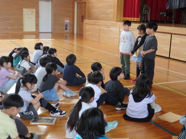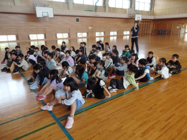 1,2年生の1,2時間目は生活の授業でした。2年生が『1年生に教えたい」という学習で、1年生に学校案内をしました。1時間目は音楽室、図書室、体育館を案内しました。音楽室ではイスの持ち方、図書室ではどこにどんな本があるのか、体育館ではボールの使い方などを教えてあげていました。1年生もお兄さんお姉さんの話を「目」でしっかり聞くことができました。