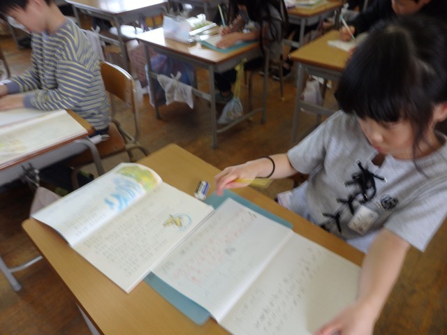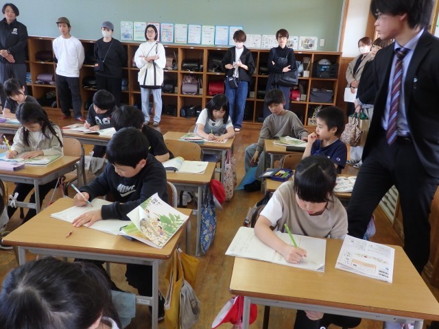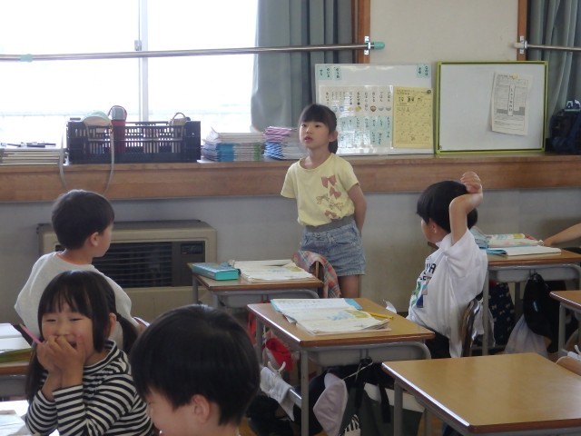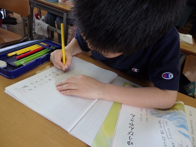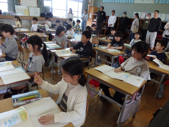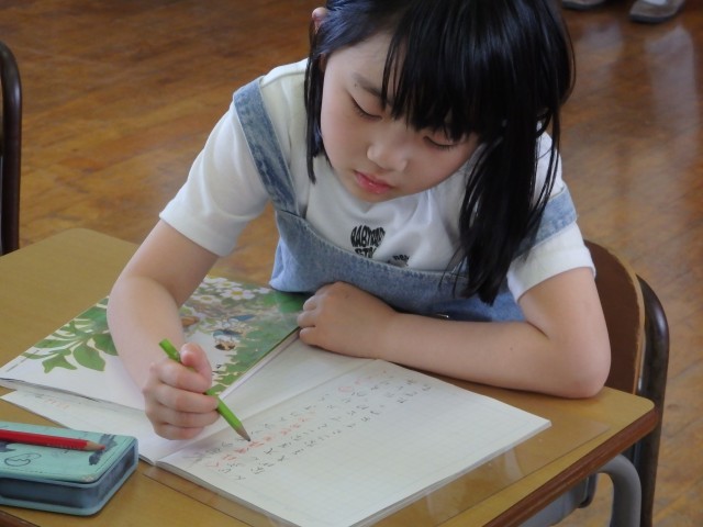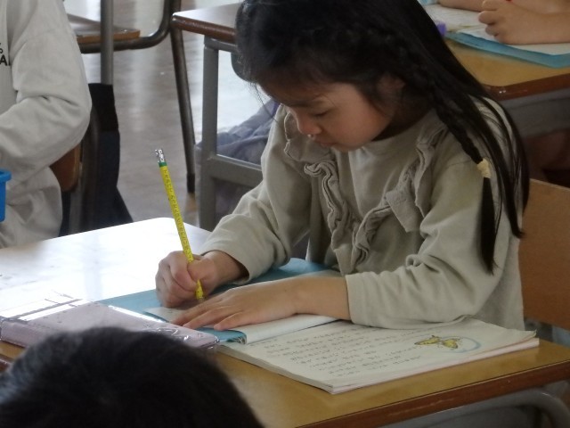 2年生の学習参観は国語の授業でした。「風のゆうびんやさん」の音読発表会でした。最初に「今日の自分のめあて」を一人一人が考えました。「大きな声でお家の人に聞こえる声で言う」「大きくしたり小さくしたりして読む」など、自分で考えためあてをノートに書きました。実際の音読発表会は他の学年を回っていて見れませんでした。すいません。最後の振り返りは「自分がよくできたところ」と「友だちのよかったところ」を書きました。ノートに7行も書けている子がいました。すごい!