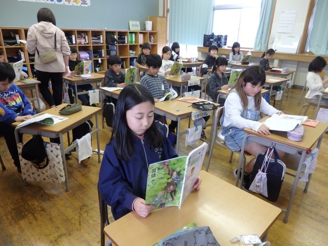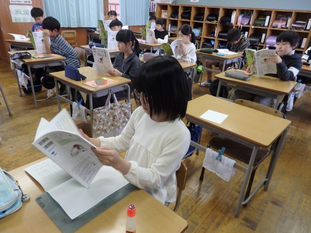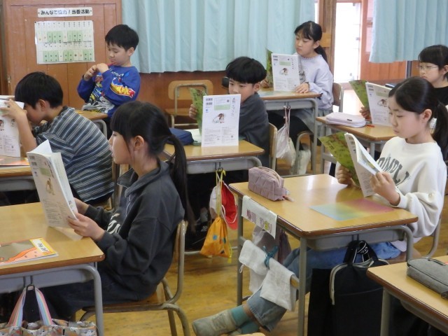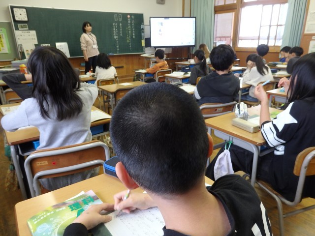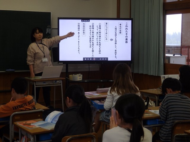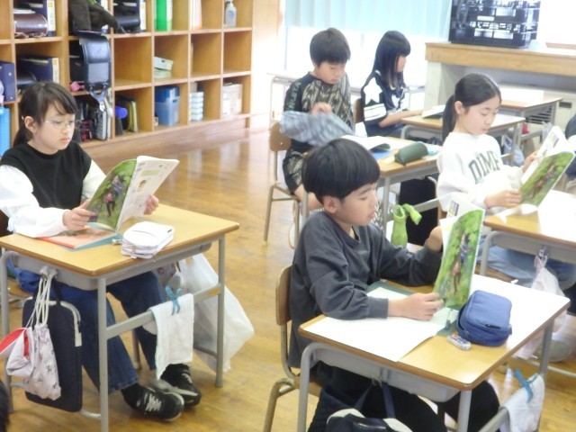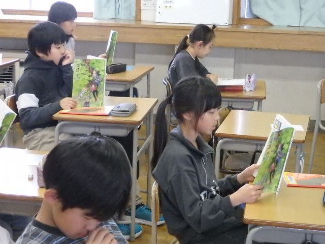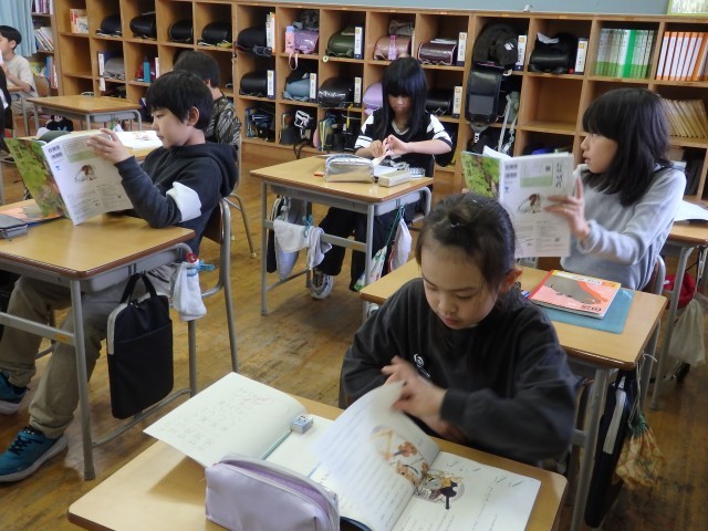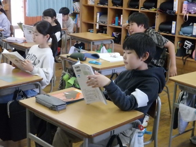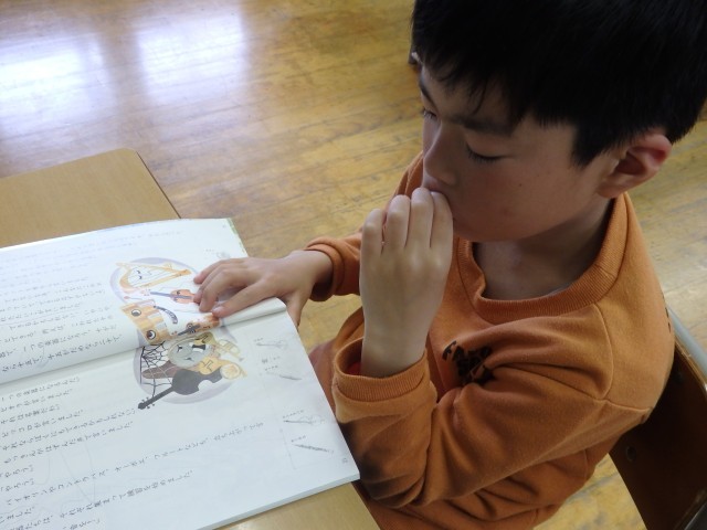 4年生の3時間目は国語の授業でした。いつものように漢字の「3分間チャレンジ」を行ってから、「こわれた千の楽器」の学習です。まずは、みんなで丸読みをしました。誰もつっかえることなくスムーズに丸読みが進んでいきました。また、とても上手に登場人物の心情を表す読み方をしている子が何人もいました。読み終わったところで、先生から「単元の目標」「身に付けてほしい力」「今日のめあて」が示されました。今日は物語のあらすじをとらえます。「いつ」「どこで」「誰が」「何をしたのか」を読み取っていきました。