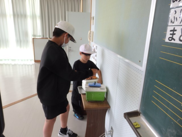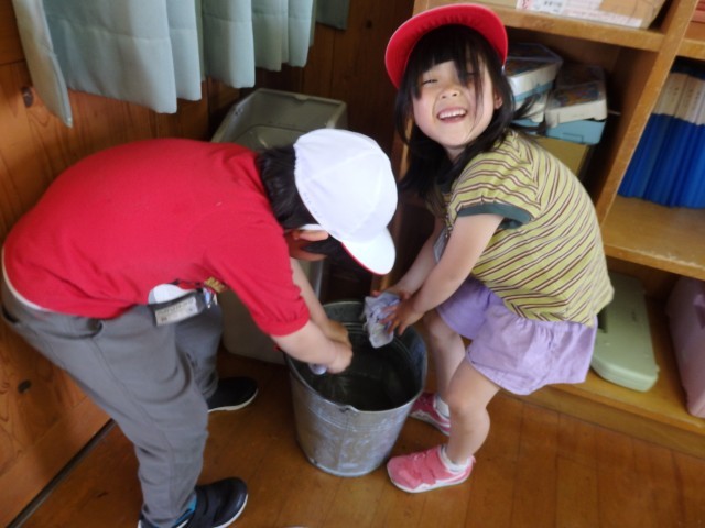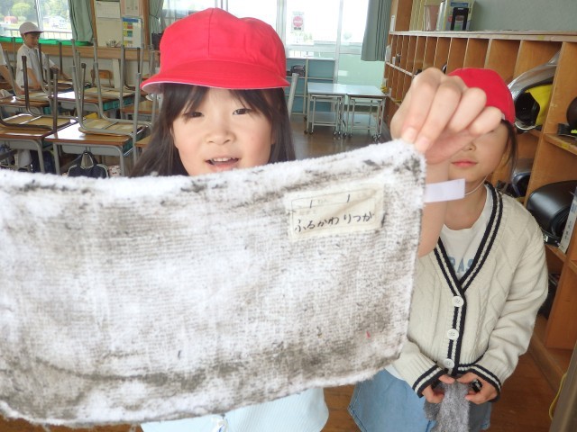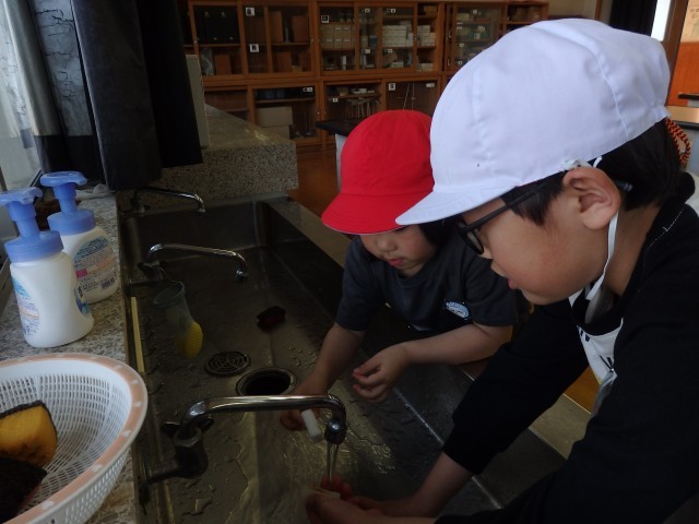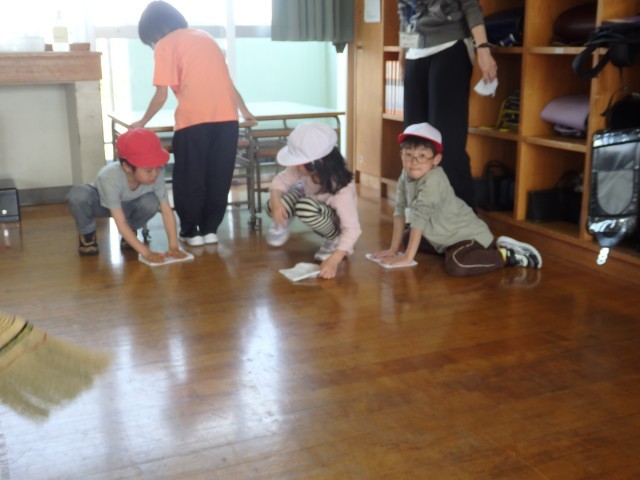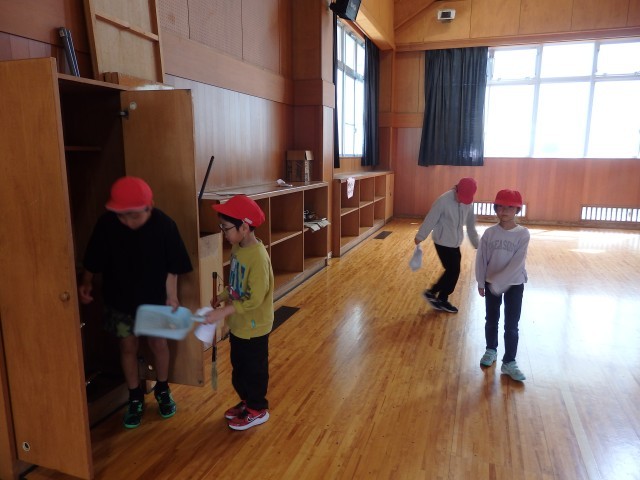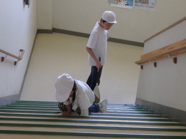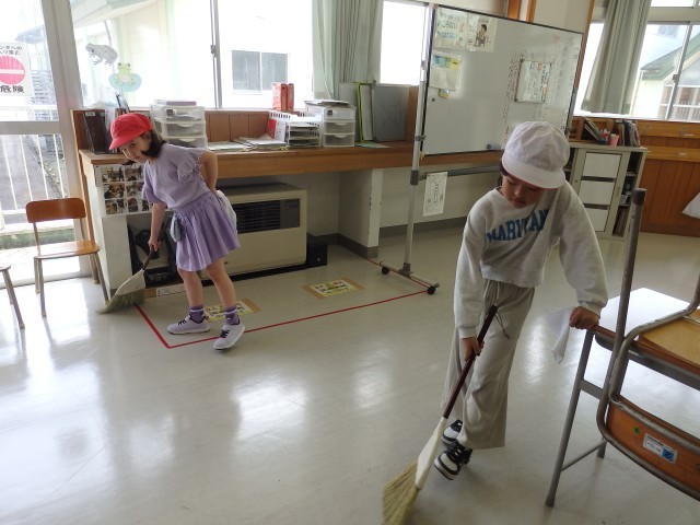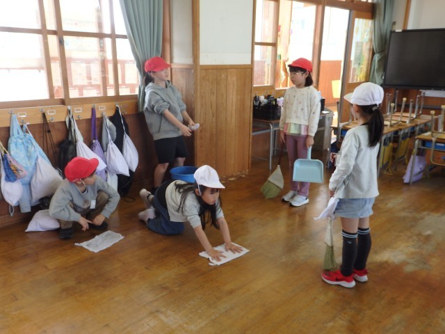 今日から1年生も加わっての清掃です。上の学年の子が下の学年の子に掃除のやり方を教えながら取り組んでいました。