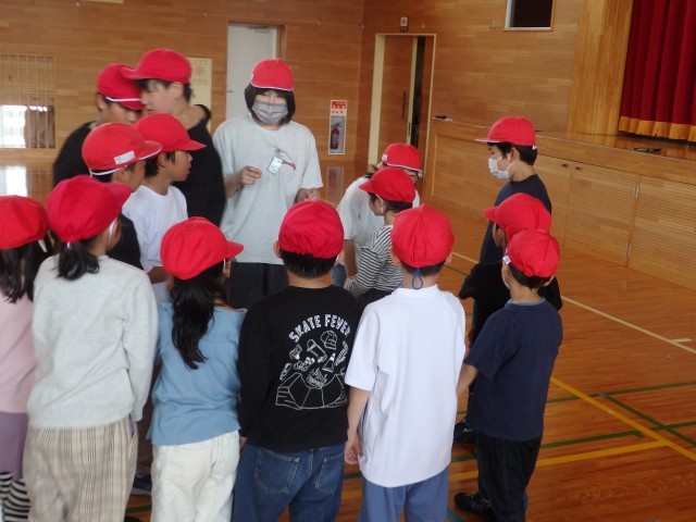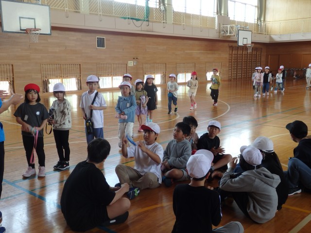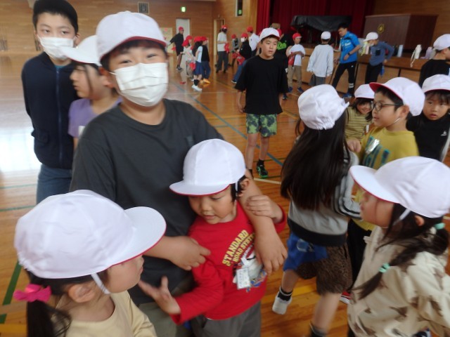 「1年生ようこそ週間」の取組として、6年生が5時間目に1年生と一緒に遊びました。2チームに分かれて「しっぽ取り王様オニごっこ」と「きつね狩り」をしました。6年生が優しく1年生に接してくれている姿に感動しました。
