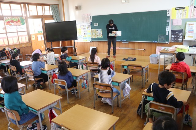 読み聞かせボランティアの羽吹様から「しゃっくりがいこつ」「にんじゃ きくんじゃ でんごんじゃ」の2冊を読んでいただきました。