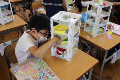 もう完成に近づいた児童もいました。しかし、教師の「コースを工夫して、2〜3ルートを作った方が楽しいよね」という言葉がけにより、子どもたちはさらに工夫して製作に取り組んでいました。