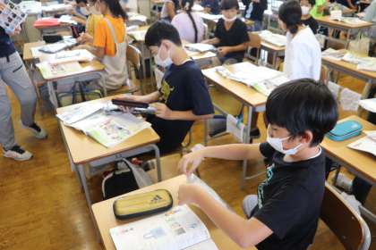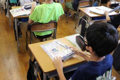 裁縫で「袋作り」に取り組みます。その前に、目的に合わせて袋の「形や大きさ、デザイン」「縫い方」「材料」が違うことを話し合いました。そして授業の終わりに、教師から袋の材料が配られました。