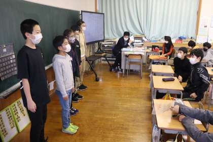前半は、明日の生活朝会で行われる「いじめ見逃しゼロスクール集会」の発表練習を行っていました。前に立って発表する5人とその他の子どもたちで声を合わせながら、6年生の取り組みと決意を堂々と発表していました。