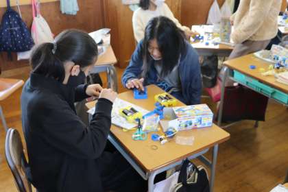 1限、5年生は理科で電磁石の学習でコイルモーターを作っていました。