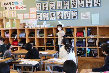 3限、4年生は道徳で「かべにつけた手のあと」を教材に学習しました。