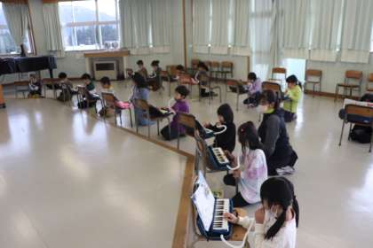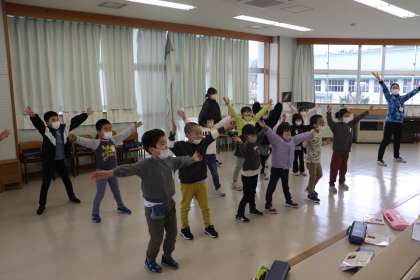 鍵盤ハーモニカのテストの前に、体を温めるために「ジングルベル」の曲に合わせて踊りました。どの子どももノリノリで楽しく踊っていました。