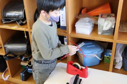 1限、2年生は図工の工作「パタパタストロー」の学習でした。