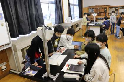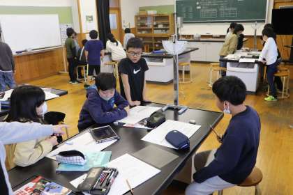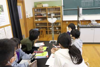3限、5年生は理科室で理科「振り子の運動」の学習。