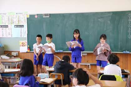 2限、4年生は国語「こわれた千の楽器」の音読発表会でした。