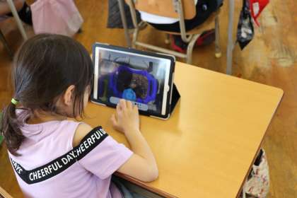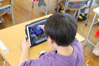 iPadをつかって、玄関前で栽培しているあさがおの様子を撮影しました。