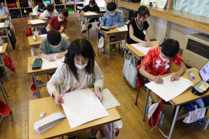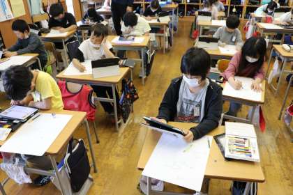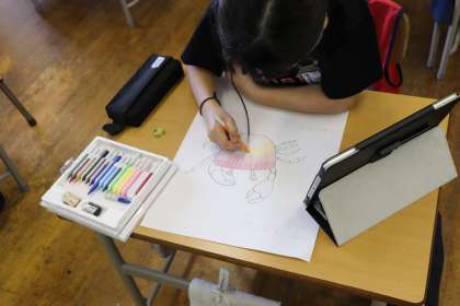 iPadで水生生物を調べ、紙に絵や言葉を書き込んでいました。
