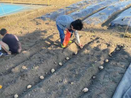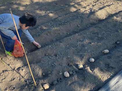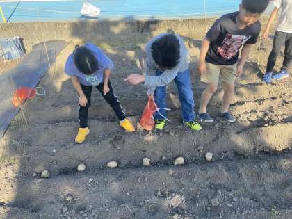 昨日の放課後、学校のグラウンドに来ていた児童たちから、ジャガイモの種芋植えの準備をしてもらいました。