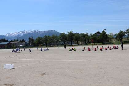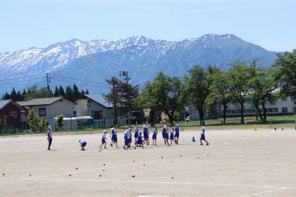 グラウンドで玉入れの動きを練習しました。