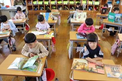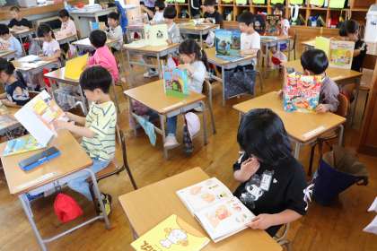 教室で、しっかりと読書タイム。早く読んでしまえる本を借りた児童は何度も読んでいました。
