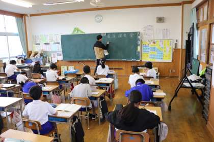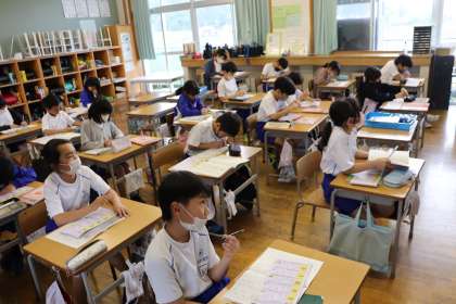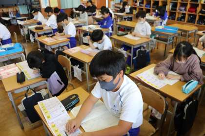 3限、全校運動会練習が降雨のため延期となり、4年生は教室で漢字練習をやっていました。