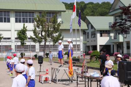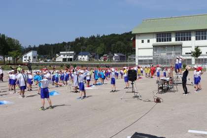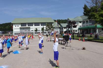高学年のラジオ体操プロジェクトが前に立ち、全校でラジオ体操を行います。
