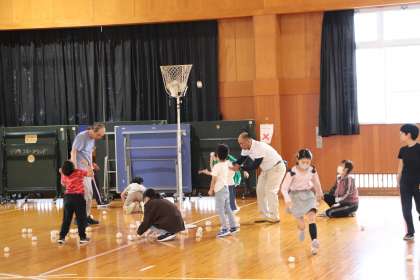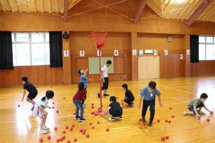 次に、運動会の学年部種目の練習。「玉入れ」と「めくってめくって」を全員でやってみました。