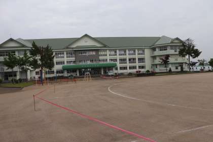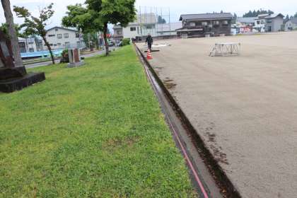 児童の安全を考え、赤いテープをグラウンドに張らせていただきました。