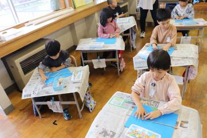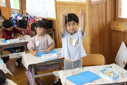 児童は、粘土板の上で手を上手に使ってひもひもねんどを作っていました。