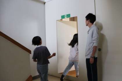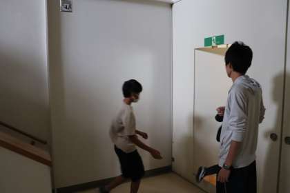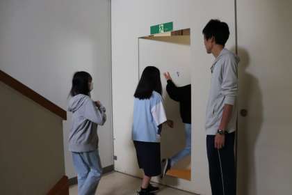 防火扉が閉まった場合の、くぐり戸から逃げる練習を行いました。