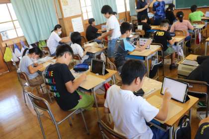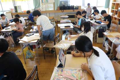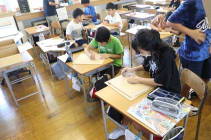 2限、5年生は図工「糸のこスイスイ」の学習。