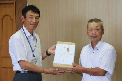 本日、地域づくり協議会会長の廣田様が来校され、全校児童が参加した「交通安全標語コンクール」の参加賞を届けてくださいました。