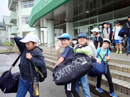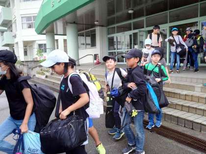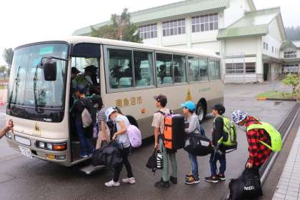 5年生、たくさんの荷物を持ってバスに乗り、学校を出発しました!