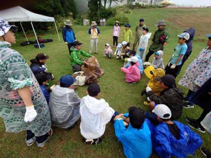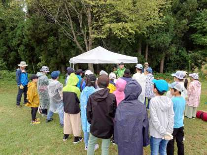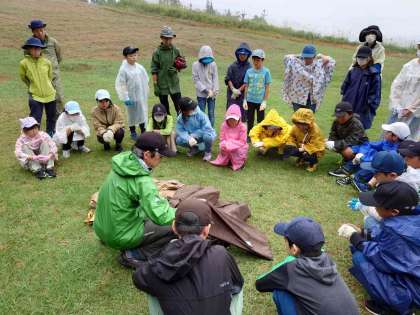 小雨の天候ですが、雨具を着てテントの設営体験をはじめました。