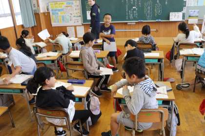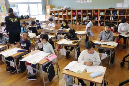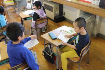 1限、2年生は道徳「竹馬と一りん車」の学習。