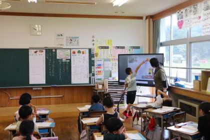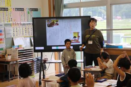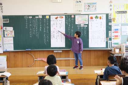 2限、1年生は国語「サラダでげんき」の学習。この授業の南魚沼市学習指導センターの荒井指導主事の参観授業でした。