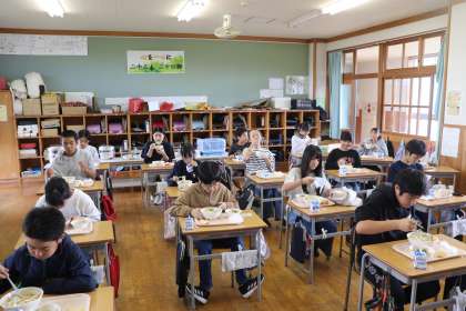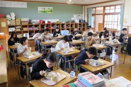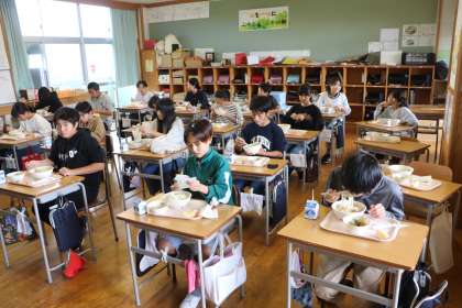学生さん1人は6年生と一緒に給食を食べていました。