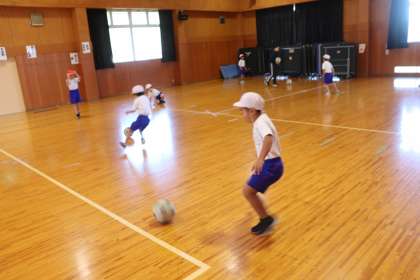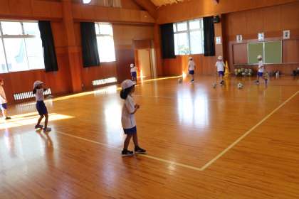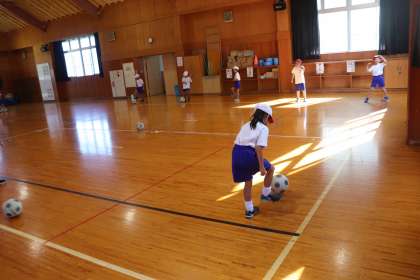 1限、2年生は第2体育館で体育「ボールけりゲーム」。