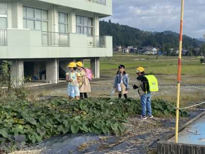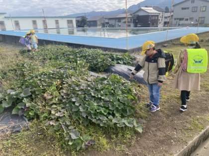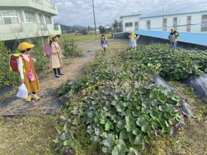 朝登校すると、1年生はさつまいも畑に行っていました。