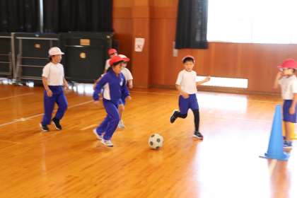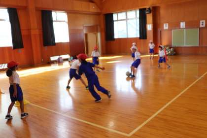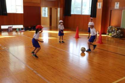 2限、2年生は体育で「ボールけりゲーム」の学習。