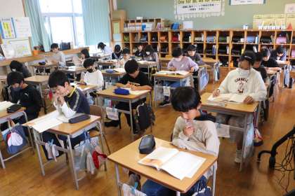 教師が範読をしていました。児童はしっかりと聞き、読み方が分からない字にふりがなを書いていました。
