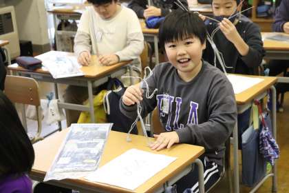 どうすれば針金を曲げたものが立ち上がるのか。試行錯誤しながら、児童は真剣に活動していました。