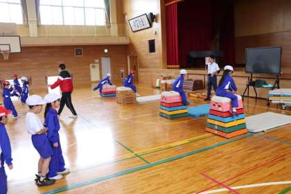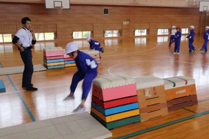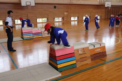 その後、3つ跳び箱を組み合わせて連続で跳ぶ練習をしていました。
