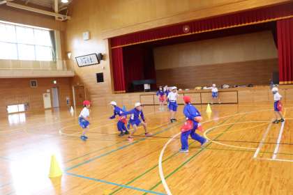 3限、4年生は体育館で体育「フラッグフットボール」の学習でした。