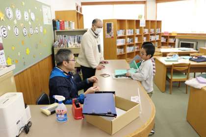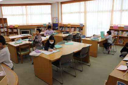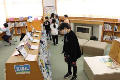 教室で読書をするために、図書室で本を選んでいました。
