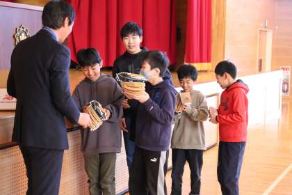 ひまわり朝会の最後は、大谷翔平選手から寄付していただいたグローブの紹介。