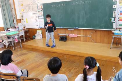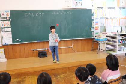 など、これまで練習してきたむかしの遊びについて、「がんばったこと」なども伝えながら発表していました。