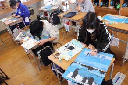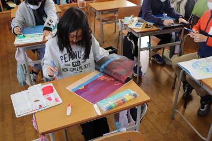 2限、5年生は図工「彫り進めて刷り重ねて」の学習。