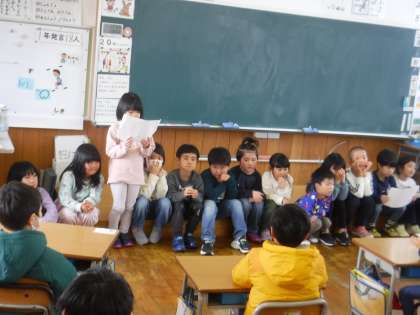 読み聞かせをしたり、学校のことを紹介したり、図工で作った作品で遊んだりしました。