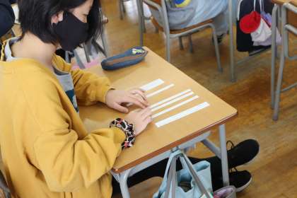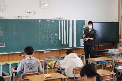 児童は文が書かれた紙を並べて、順番を考えました。
